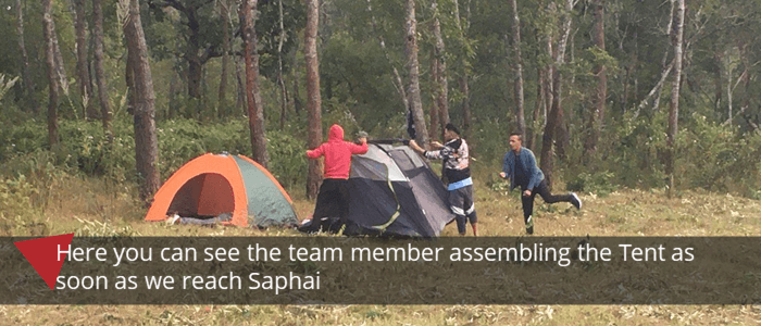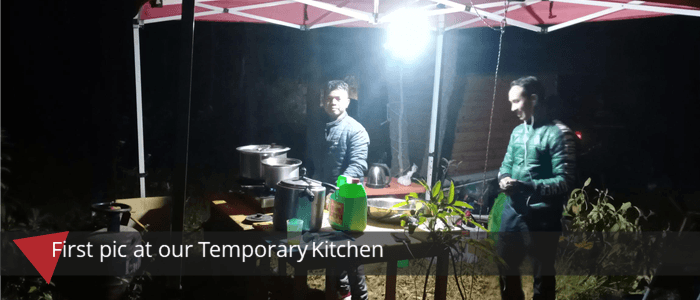 The team assembled a Tiny Cabin in one day for creating an office. Tents were used for sleeping. Makeshift kitchen sheds set up for cooking.